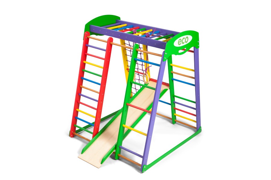 Дитячий спортивний комплекс для дому Akvarelka mini призначений для дітей молодшої вікової категорії і може витримувати максимально допустимі динамічні навантаження до 40 кілограм. Він виготовлений з натуральних матеріалів - екологічно чистої деревини бука і сосни. Яскравий різнокольоровий дизайн обов'язково приверне увагу Вашої дитини і зможе захопити різноманітними рухливими іграми та спортивними вправами. Він стане відмінним доповненням дизайну дитячої кімнати як хлопчика, так і дівчинки. Цей спортивний комплекс не вимагає кріплення і дуже простий в установці і збірці.